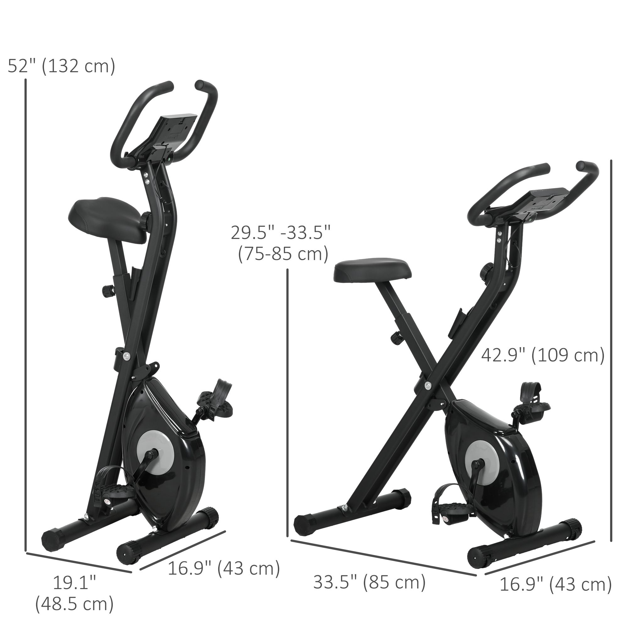 • Foldable Exercise Bike Info: Overall Dimensions: Upright Size: 16.9" L x 33.5" W x 42.9" H (43 x 85 x 109 cm), Folding Size: 16.9" L x 19.1" W x 52" H (43 x 48.5 x 132 cm), Handle Height: 42.9" H (109 cm), Seat Height: 29.5"-33.5" H (85-75 cm), Seat Pad Size: 11" L x 8.7" W (28 x 22 cm), Weight Capacity: 264lbs (120 kg).