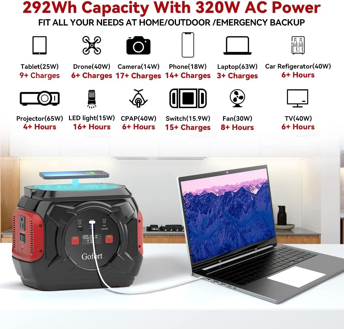 1.[292Wh/80000mAh Capacity Will Cover All Your Needs] Gofort A301 Portable Power Station With 292Wh Capacity; Is Ideal For Different Kinds Of Electricity Demands Outdoor Usage For Home; CPAP Machine; Power Outage; Travel; Camping; Adventure; Backseat On Long Road Trips.
