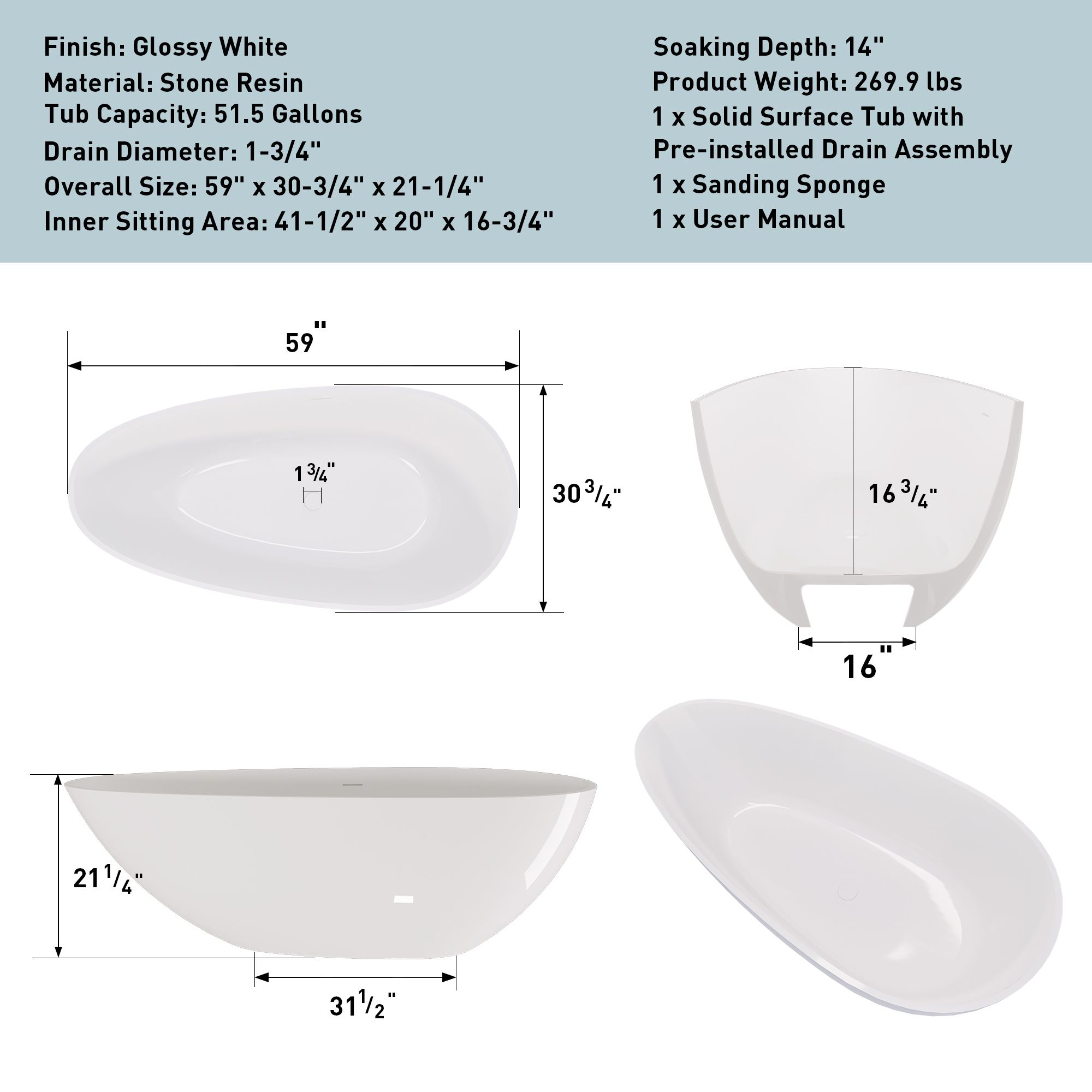 Bring the Spa Home: Wash away worries with a soak in our glossy white 59" x 30-3/4" x 21-1/4" freestanding bathtub. The sleek, modern curved tub with its agile and artistic lines creates a spa-like, immersive bathing experience that combines luxury with practicality and adds to the décor of any bathroom.