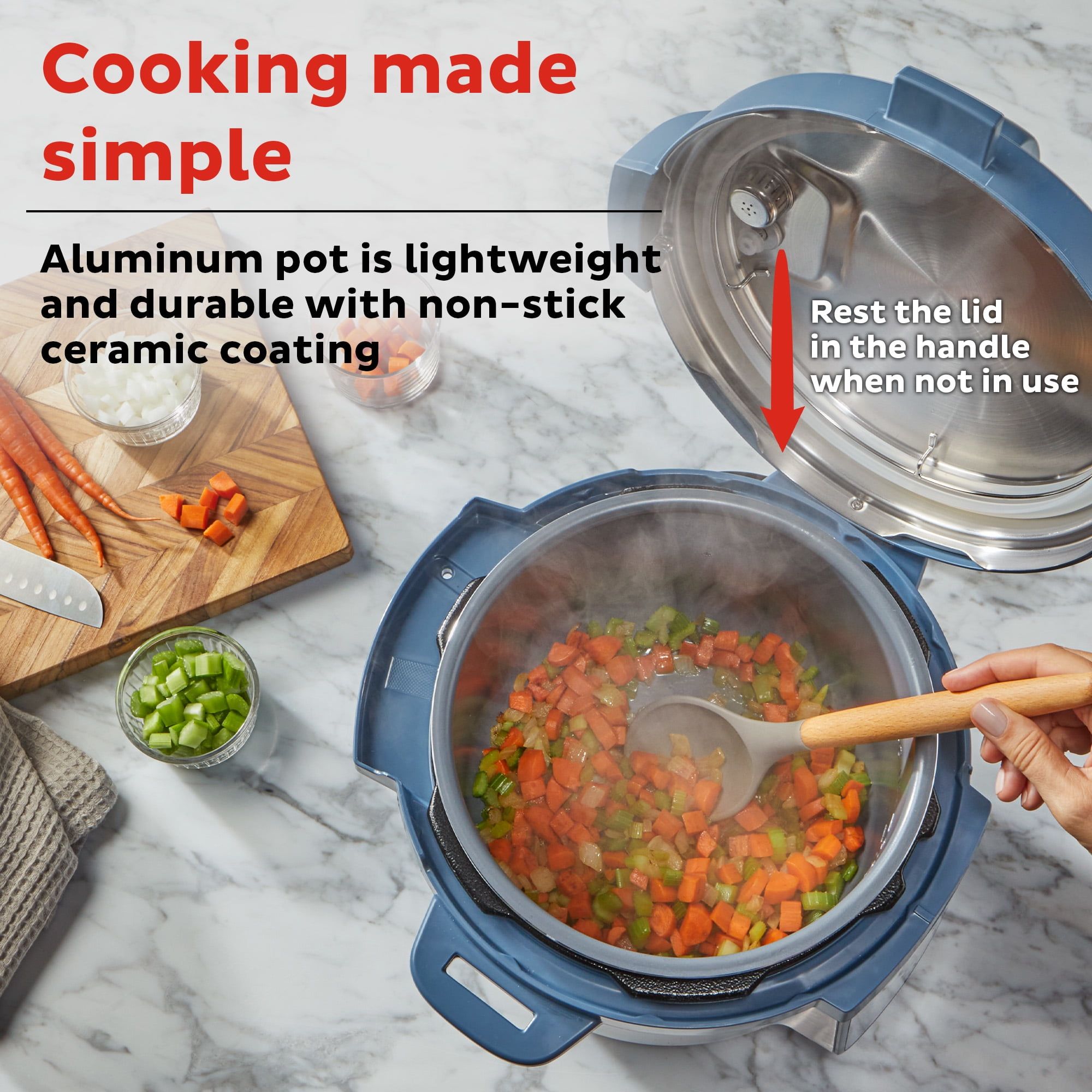 Combining sleek design with powerful functionality, it features 7 cooking functions and 4 customizable presets to save your favorite settings. The non-stick, ceramic-coated aluminum pot ensures even cooking and easy cleanup, while the slim design fits perfectly on your countertop without sacrificing capacity. Big enough to serve six or leave plenty for leftovers, it’s perfect for families or meal preppers. The Easy-Release steam switch makes venting hassle-free.