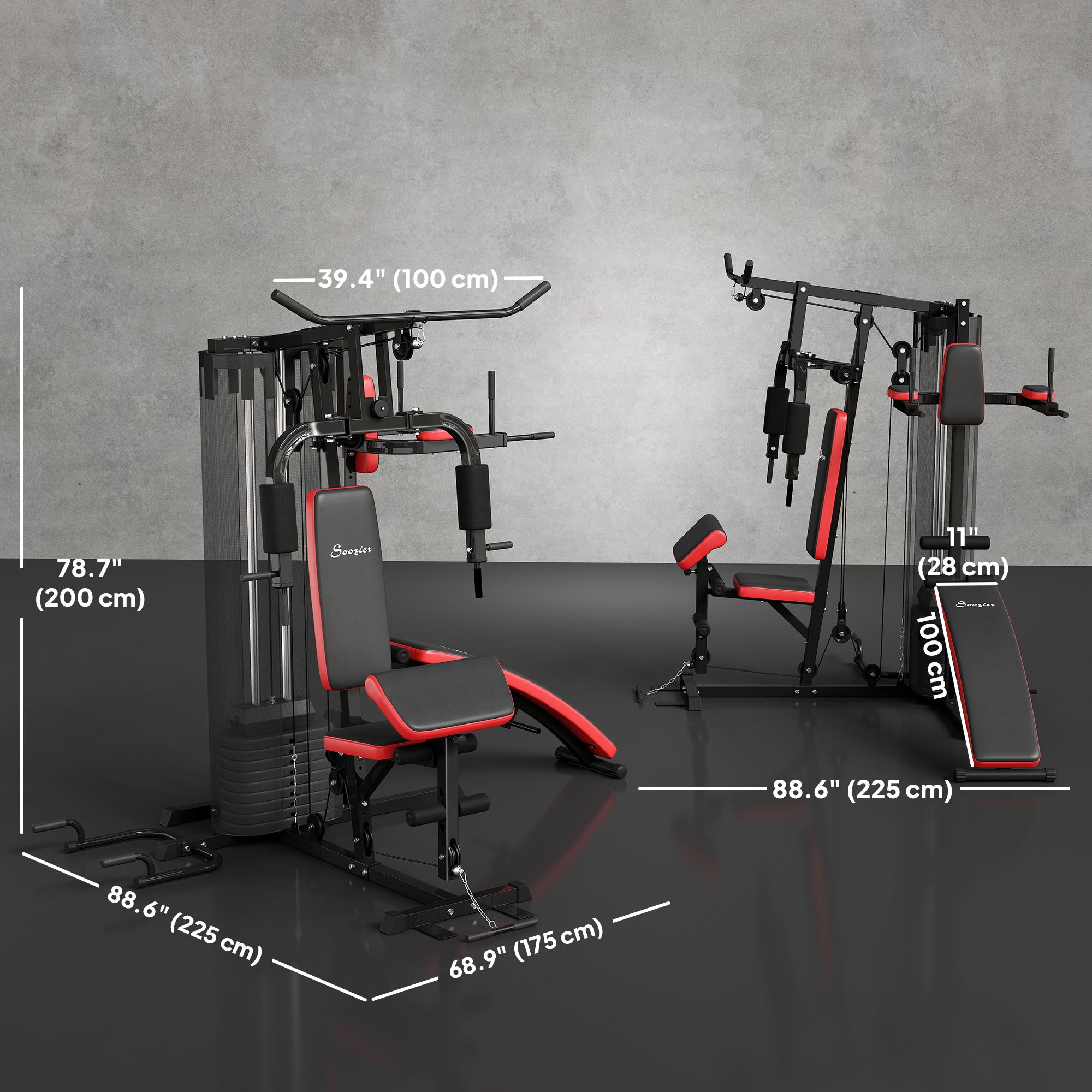 • Workout Machine Info: Overall Dimensions: 88.6" L x 68.9" W x 78.7" H (225 x 175 x 200 cm). Weight Capacity: 242lbs (110kg). Please note that our gym equipment is shipped in five packages and may arrive on different dates.