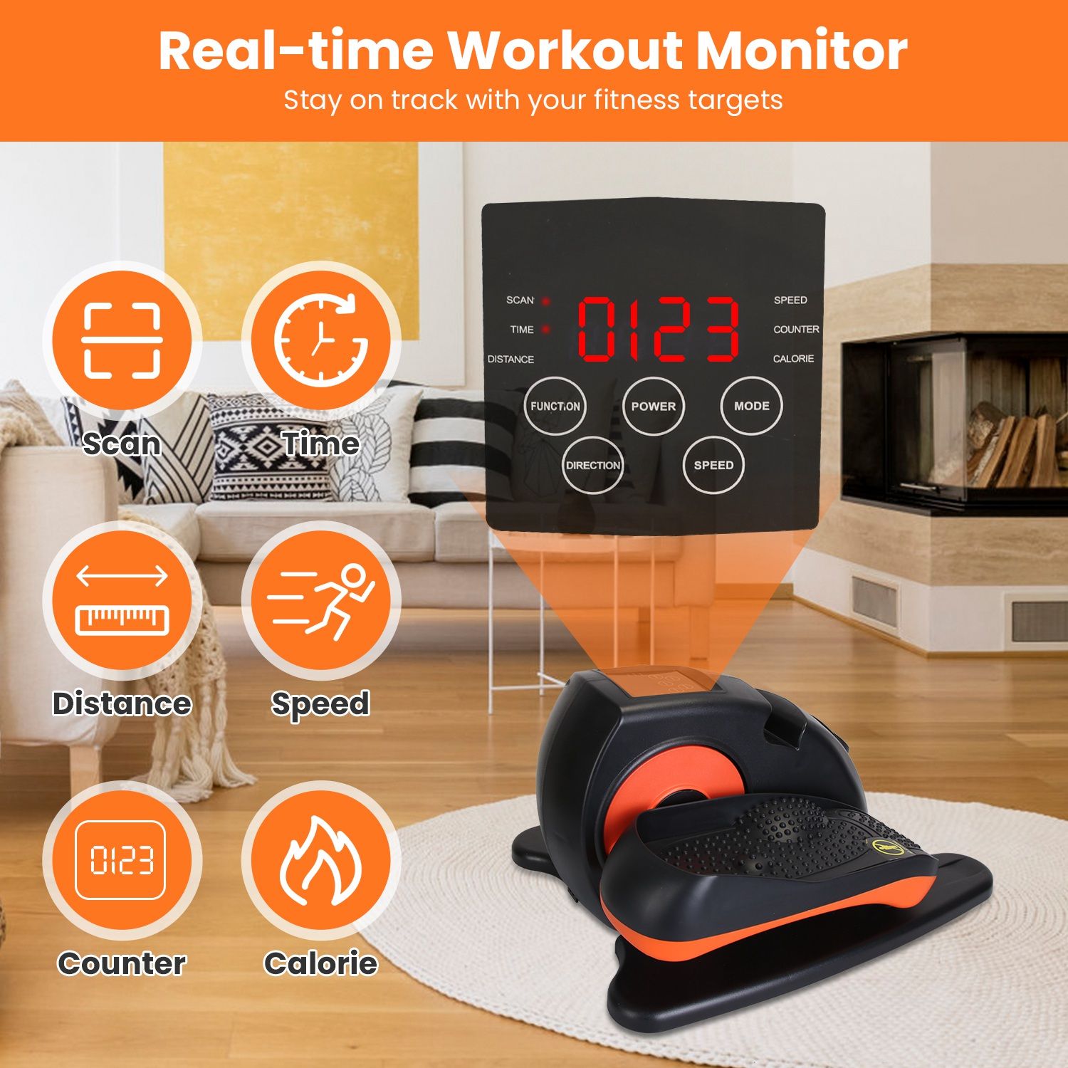 *Real-time Workout Monitor*:This desk workout equipment also features clear digital display,which provides comprehensive workout data,including speed,time,distance traveled,calories burned,and elapsed workout time,helping you to monitor your progress and stay motivated. The 60W motor powers the elliptical smoothly and quietly,making it an ideal addition to an office or home environment where noise might be a concern.
