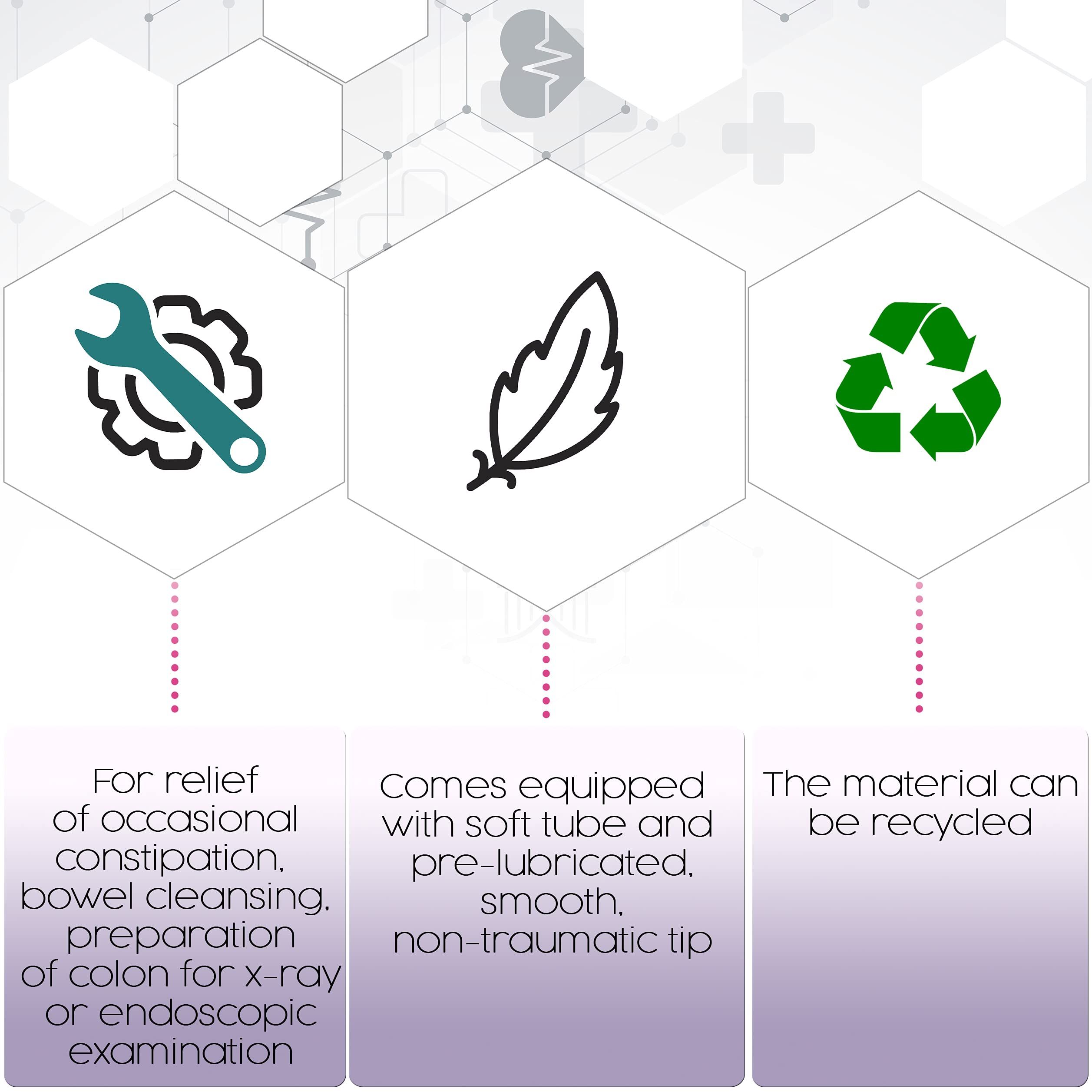 3.CONTENTS: Comes equipped with soft tube and pre-lubricated, smooth, non-traumatic tip with rounded eyes for patient safety and easy insertion.1 - 1500 mL Vinyl Enema Bag, 1 - Vinyl Tubing with Pre-lubricated Tip, 1 - Tube Clamp, 1 - Protective Tip Cover, 1 - Moisture-proof Drape, 1 - Enema Soap Packet.